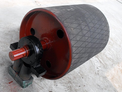 傳動滾筒是輸送機傳遞動力的部件。其驅動帶式輸送機的方式有單滾筒、雙滾筒及多滾筒之分。單滾筒多用于功率不太大的輸送機上,如煤礦地面運輸及選煤廠等處。井下帶式輸送機一般均采用雙滾筒,以使輸送機結構緊湊。傳動滾筒表面有裸露光鋼面,人字形和菱形花紋橡膠覆面。小功率、小帶寬及環境干燥時可采用裸露光鋼面。人字形花紋膠面摩擦系數大,防滑性和排水性好,但有方向性。菱形膠面用于雙向運行的輸送機。
